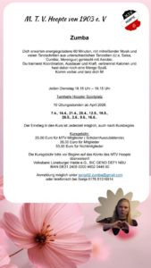 Bist du bereit, den Alltag wegzutanzen? Ab April 2026 wird es in der Turnhalle am Hoopter Sportplatz rhythmisch! Wir starten einen neuen Zumba-Block und laden dich ein, Teil unserer energiegeladenen Gruppe zu werden. Was erwartet dich? Zumba ist die perfekte Mischung aus Tanz-Workout und purem Lebensfreude. Zu mitreißenden Klängen von Salsa, Cumbia und Merengue kombinieren …