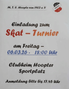 Der M. T. V. Hoopte von 1903 e. V. lädt herzlich zum Skat-Turnier ein! Wann: Freitag, 06.03.26 um 18:00 Uhr Wo: Clubheim Hoopter Sportplatz Wichtiger Hinweis: Die Anmeldung erfolgt bitte direkt vor Ort bis 17:45 Uhr.