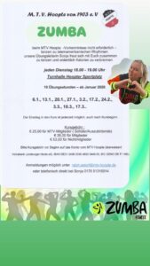 Beim MTV Hoopte -Vorkenntnisse nicht erforderlich – tanzen zu lateinamerikanischen Rhythmen unsere Übungsleiterin Sonja freut sich mit Euch zusammen zu tanzen und ordentlich Kalorien zu verbrennen. Jeden Dienstag 18.00 – 19.00 Uhr Turnhalle Hoopter Sportplatz 10 Übungsstunden – ab Januar 2026 Termine: 6.1., 13.1., 20.1., 27.1., 3.2., 17.2., 24.2., 3.3., 10.3., 17.3.. Der Einstieg in …
